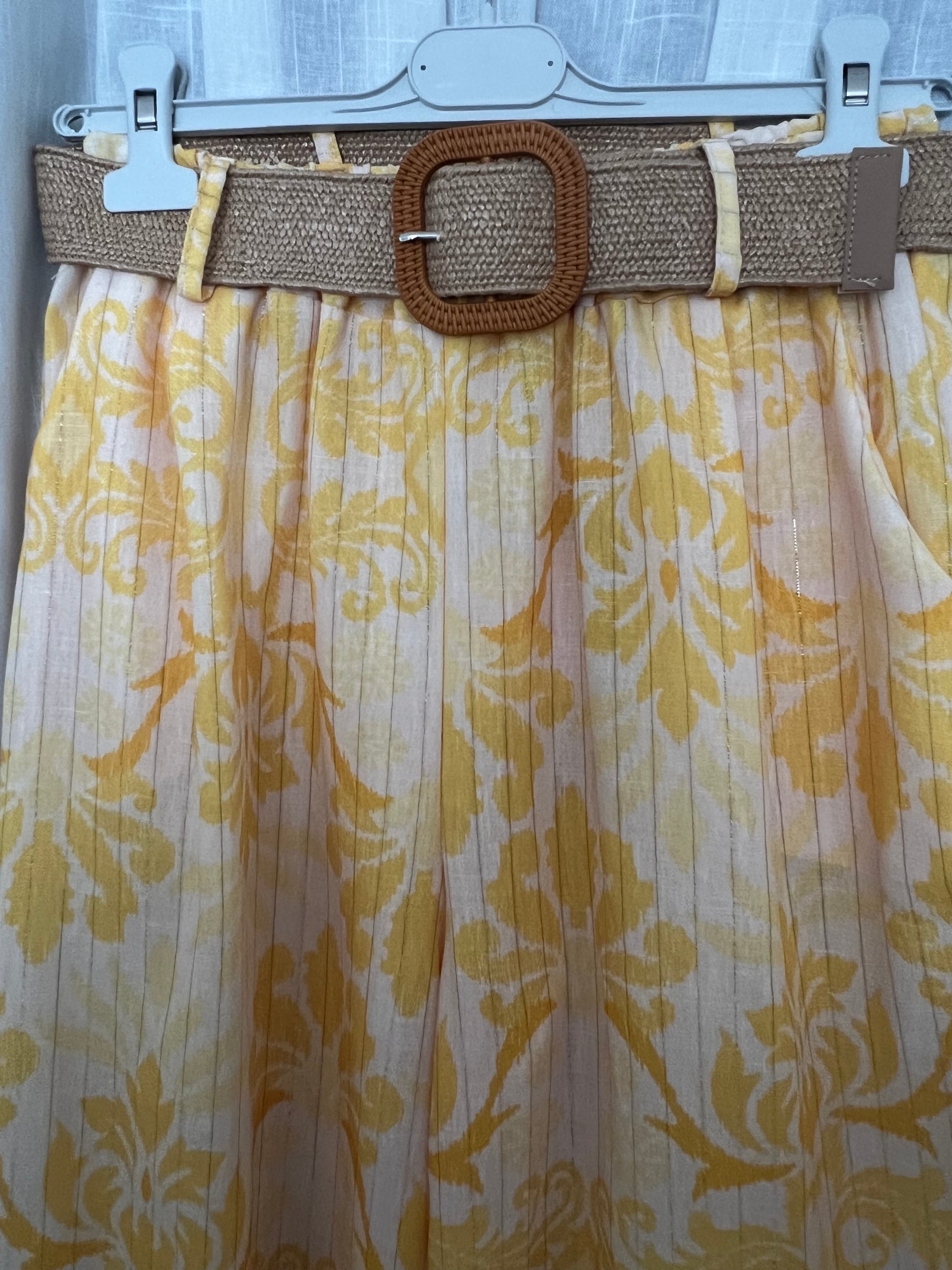 Description : pantalon fluide à motifs avec ceinture styles paillé extensible poches latérales élastique à la taille . Taille unique 34-44 longueur 98cm